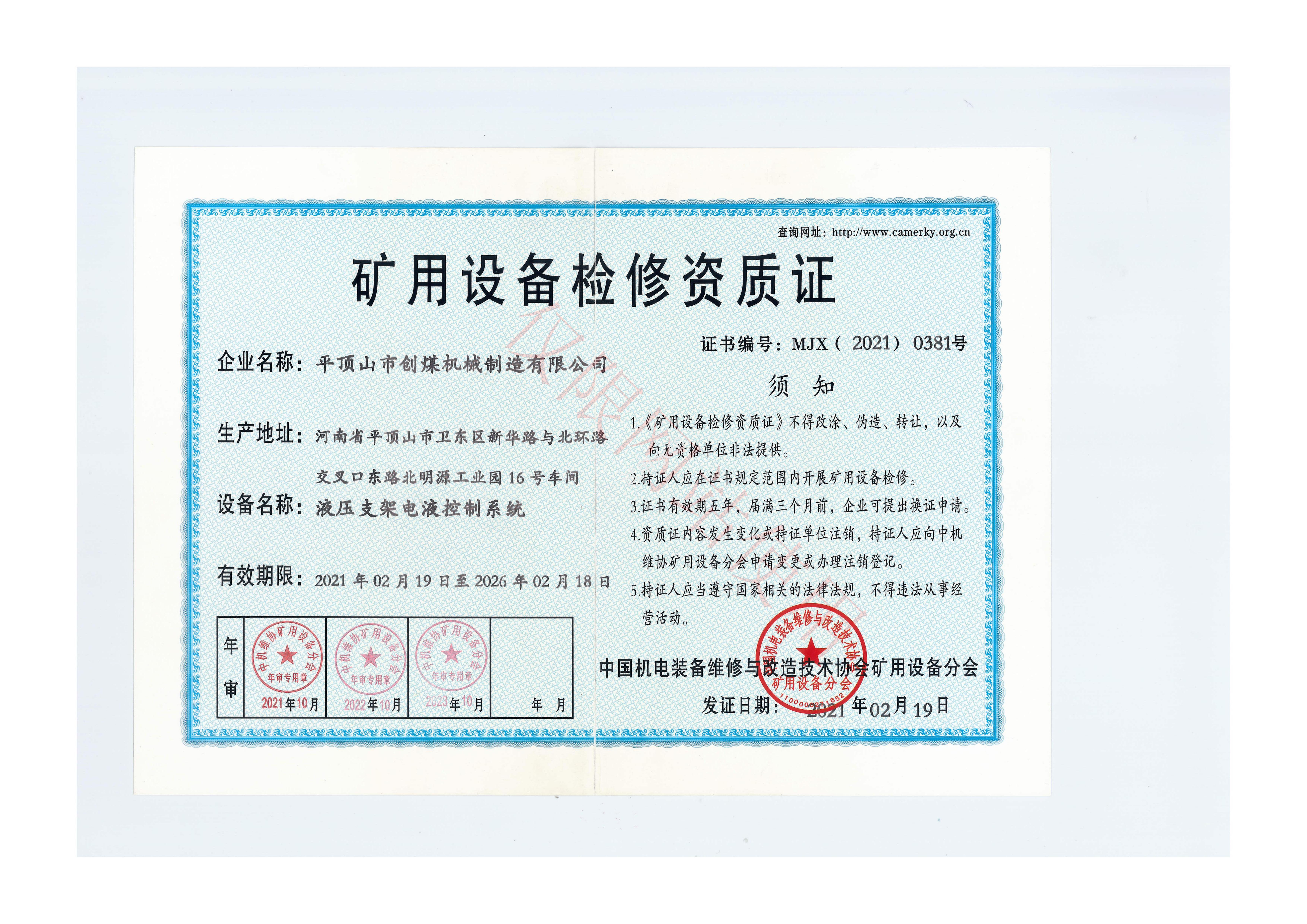液壓支架電液控制系統(tǒng)維修證書
