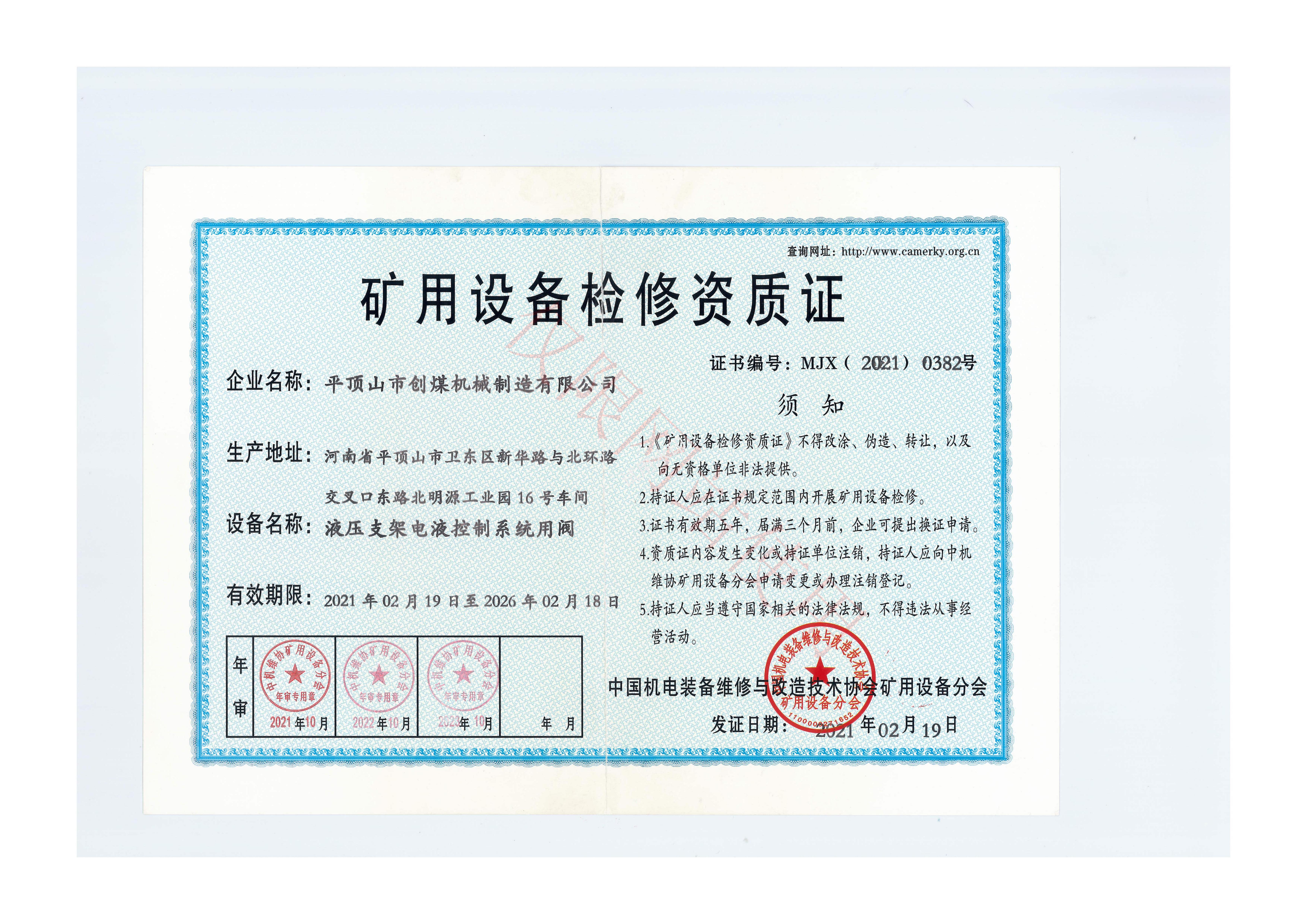 液壓支架電液控制系統(tǒng)用閥維修證書