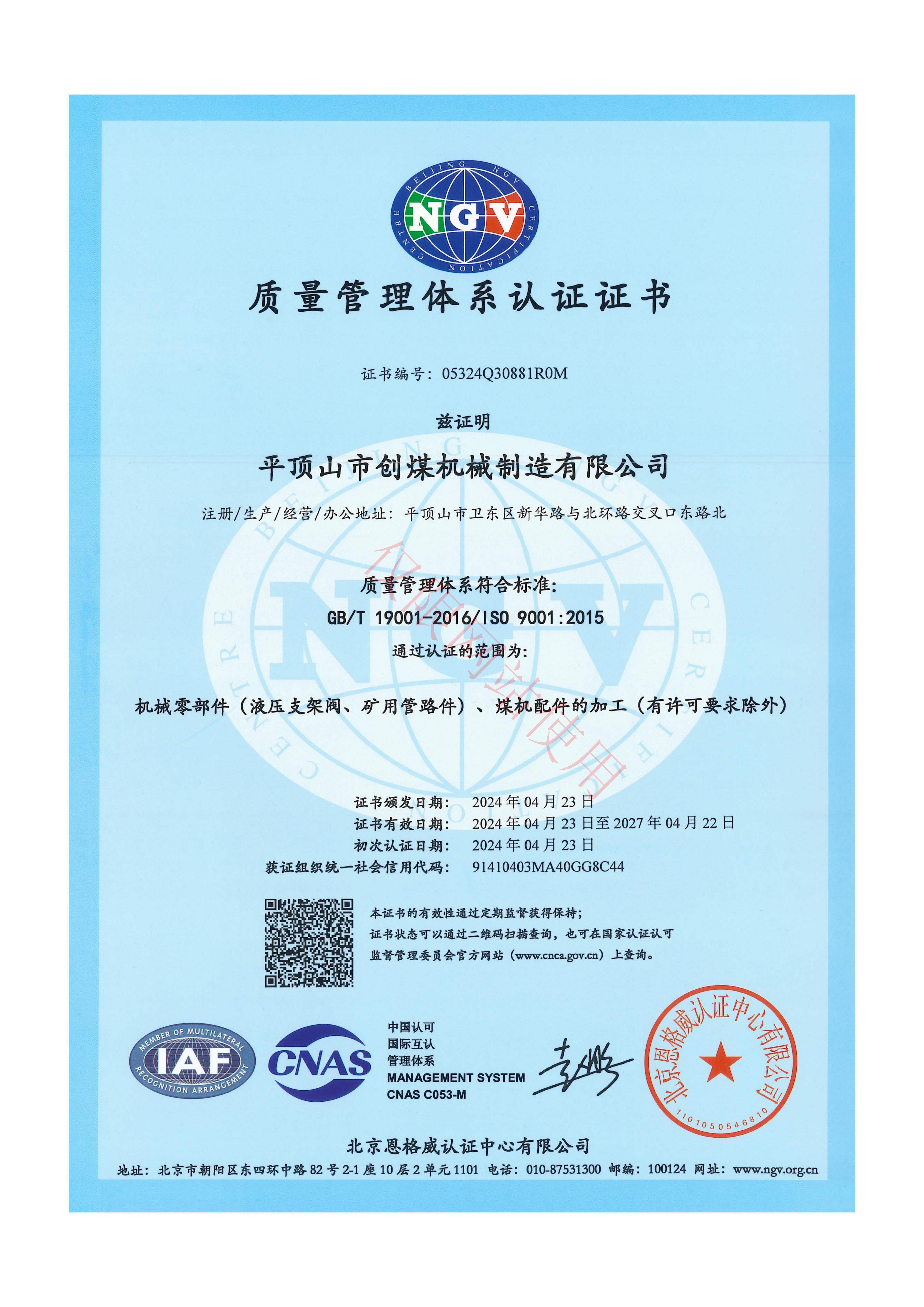 ISO質量質量管理體系認證證書